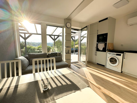 Unser Musterhaus ist ein modernes, energieeffizientes Einfamilienhaus, das alle Ansprüche an komfortables und nachhaltiges Wohnen erfüllt. Das Haus erstreckt sich über zwei Module und bietet eine Wohnfläche von ca. 52 Quadratmetern. Die offene und helle Architektur des Hauses schafft ein großzügiges Raumgefühl. Große Fensterfronten sorgen für viel Tageslicht und einen herrlichen Blick auf die umliegende Natur.